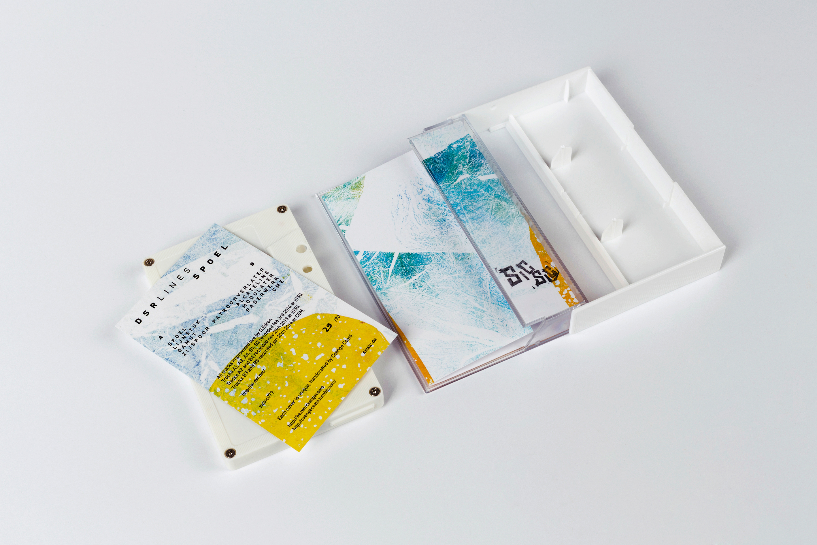 Limited Edition of 90 white chrome dubbed tapes in white cassette case with insert and unique handcrafted cover by Csenge Csato.